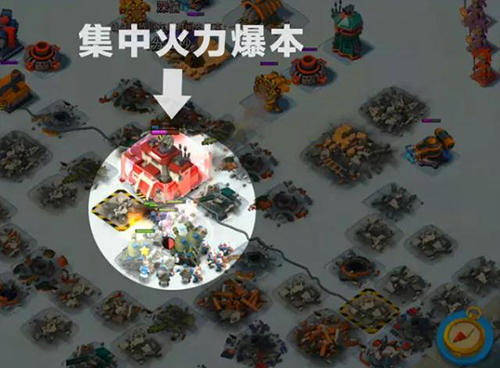 (3)部队推进的同时,利用火炮炸机器小怪监狱和冷冻炸弹,减少火箭发射器和震爆火箭炮对部队的影响(保持一定时间间隔,注意部队的位置)。
