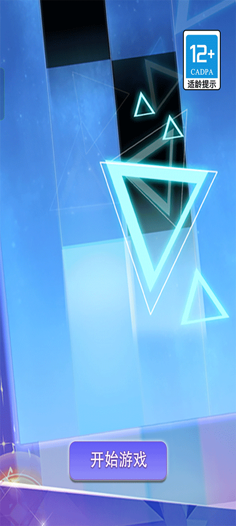 4、进入游戏后,界面会出现四个赛道,每个赛道会随歌曲的乐谱出现黑色的钢琴键,从上向下移动,点击黑色的钢琴键就会发出音符的声音,连续点击成功,音乐就会流畅的播放出来;