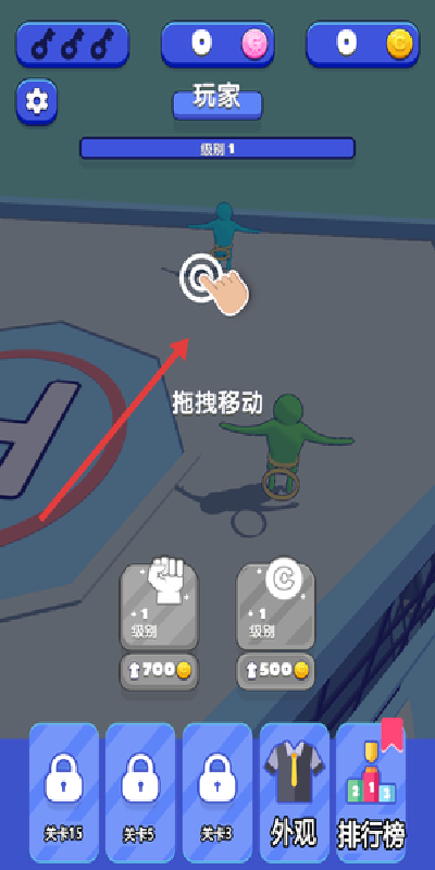 1、进入级别1后按提示拖拽角色移动,开启首场格斗挑战,准备与敌方角色在场景中对战。