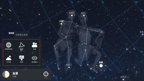 1、用户可以根据需要在天空中显示不同的网格或线条,系统默认为方位角,长按可切换到其他选项。
