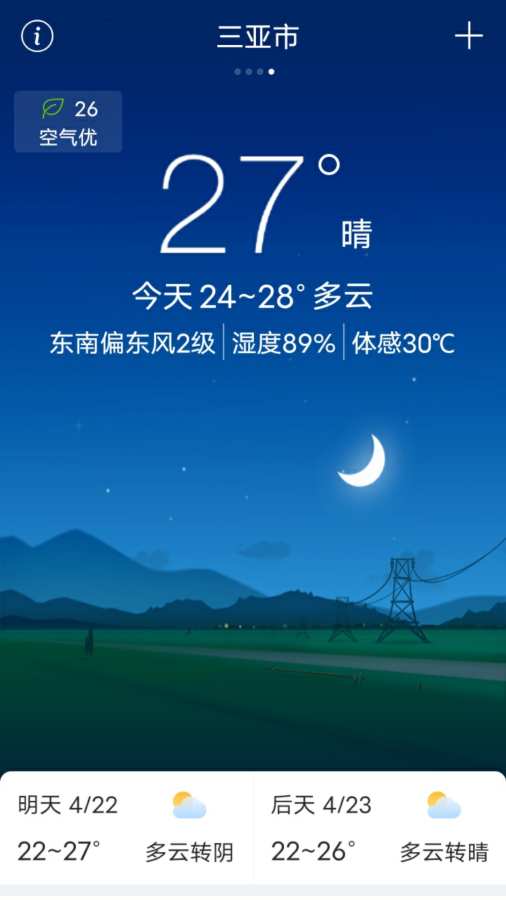 3、今天天气、温度区间、风力风向、湿度、气压等一目了然。