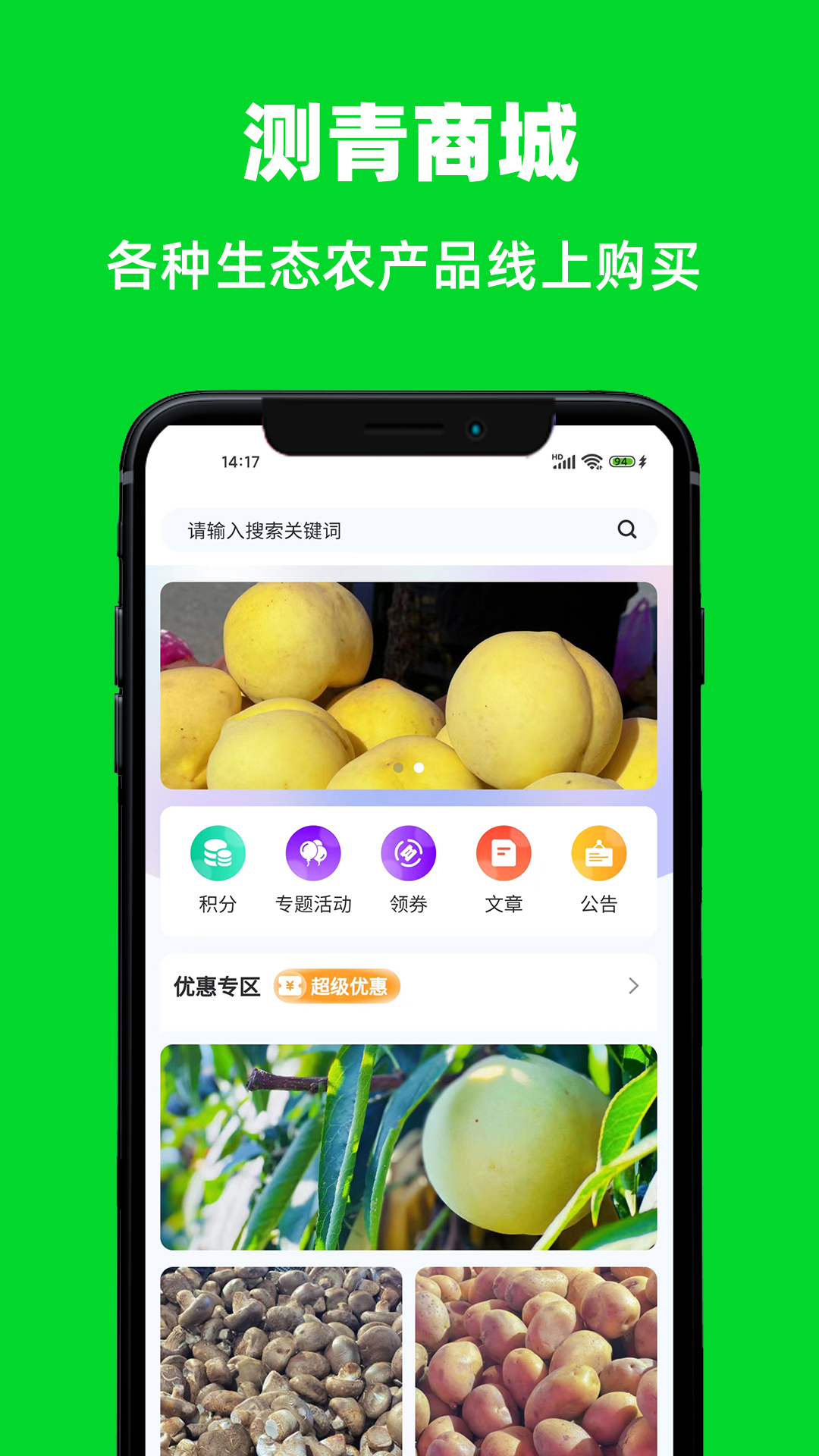 测青商城app是一款很靠谱的线上农业软件,里面有很多不同种类的农业产品,纯天然绿色食品,想要买的朋友们可以多看看哦!还有其它的功能,例如线上提前预定酒店,去玩的时候直接入住就行了,还有功能全面的充电桩服务。